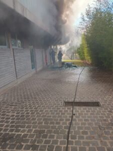 Bomberos trabajan en el interior del barrio Los Carolinos, donde se registra un incendio de grandes dimensiones en una vivienda...