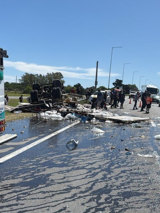 El accidente ocurrió cerca de las 15, cuando el conductor perdió el control y el vehículo terminó volcado sobre el carril derecho, quedando este completamente bloqueado. En el lugar quedaron esparcidas cientos de bolsas de hielo y botellas de agua pertenecientes a la empresa Alpes, lo que obligó a los equipos de emergencia a trabajar durante varios minutos para despejar la traza.