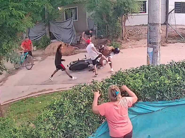 Cuando el conductor intenta pasar, uno de los jóvenes se adelanta de manera abrupta y lo intercepta. La maniobra genera que la moto pierda estabilidad y caiga al piso. De inmediato, otros integrantes del grupo se suman y rodean al vehículo para impedir que el motociclista pueda recuperarlo.