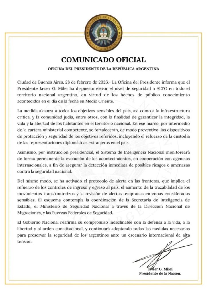 “La medida alcanza a todos los objetivos sensibles del pais, asi como a la infraestructura crítica, y la comunidad judia, entre otros, con la finalidad de garantizar la integridad, la vida y la libertad de los habitantes en el territorio nacional. En ese marco, por intermedio de la cartera ministerial competente, se fortalecerán, de modo preventivo, los dispositivos de protección y seguridad de los objetivos referidos, incluyendo el refuerzo de la custodia de las representaciones diplomáticas extranjeras en el país», informaron en un comunicado.