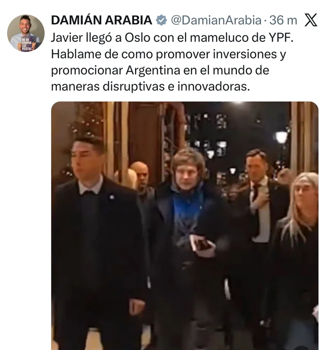 El presidente Javier Milei aterrizó este martes en Oslo para participar de la entrega del Premio Nobel de la Paz a la dirigente venezolana Corina Machado, y lo hizo con una elección estética que no pasó desapercibida: en vez de traje formal, optó por presentarse con un mameluco de YPF, un gesto que generó repercusiones inmediatas en redes sociales y en la dirigencia de La Libertad Avanza.