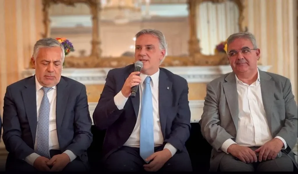 En realidad fueron Llaryora y 10 más: Alfredo Cornejo (Mendoza), Marcelo Orrego (San Juan), Carlos Sadir (Jujuy), Alberto Weretilneck (Río Negro), Ignacio Torres (Chubut), Rolando Figueroa (Neuquén), Raúl Jalil (Catamarca), Gustavo Sáenz (Salta); Claudio Vidal (Santa Cruz), y Juan Pablo Valdés (Corrientes). Es un hecho inédito que tantos mandatarios, más el presidente Milei y el ministro Caputo coincidan en un encuentro fuera del país para promocionar la Argentina. En esa línea hay que leer la declaración de Llaryora de ayer: “Es hora de ponerse la camiseta de Argentina”, dijo el mandatario provincial. También los acompañaron el viceministro de Economía José Luis Daza y el secretario de Energía, Daniel González. Uno de los responsables de organizar toda la agenda y que participó también del encuentro fue el embajador Alec Oxenford.