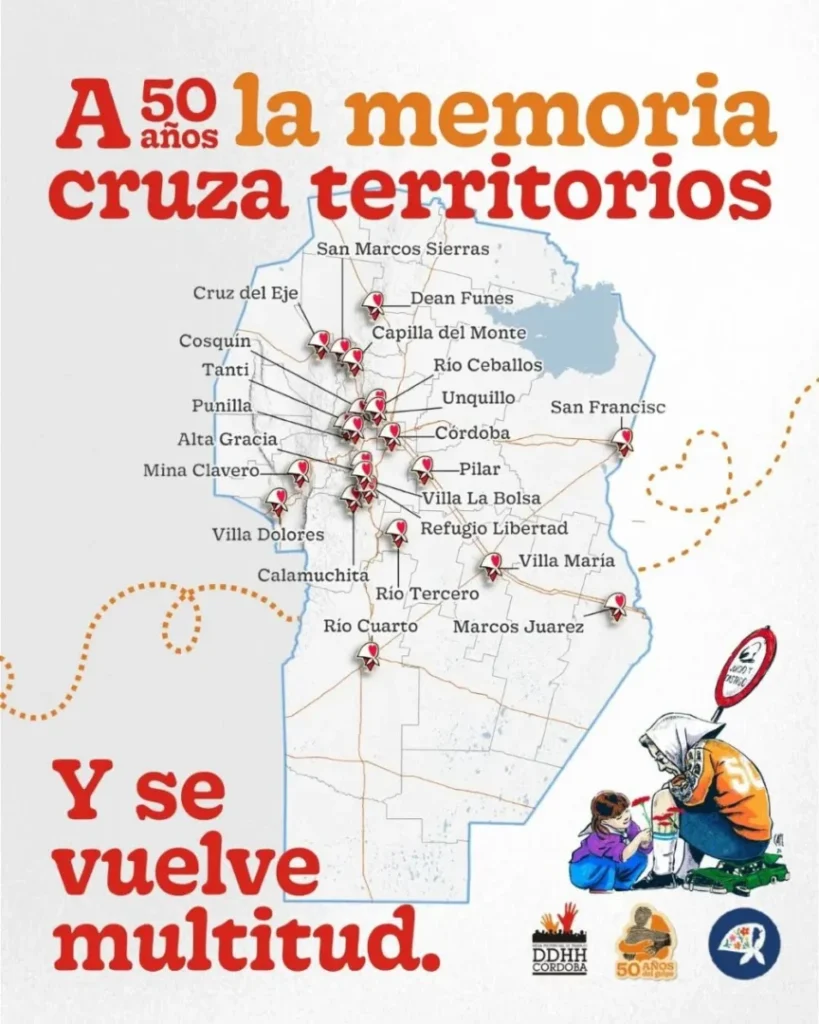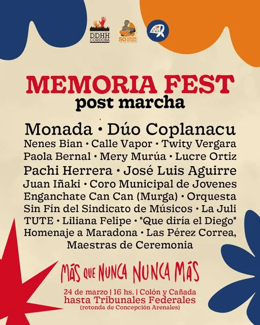 Al finalizar la marcha en la ciudad de Córdoba, se desarrollará el “Memoria Fest” en la rotonda de Concepción Arenales, en el Parque Sarmiento, en la zona de los Tribunales Federales. El evento propone un cruce entre arte y memoria a cinco décadas del inicio de la última dictadura.